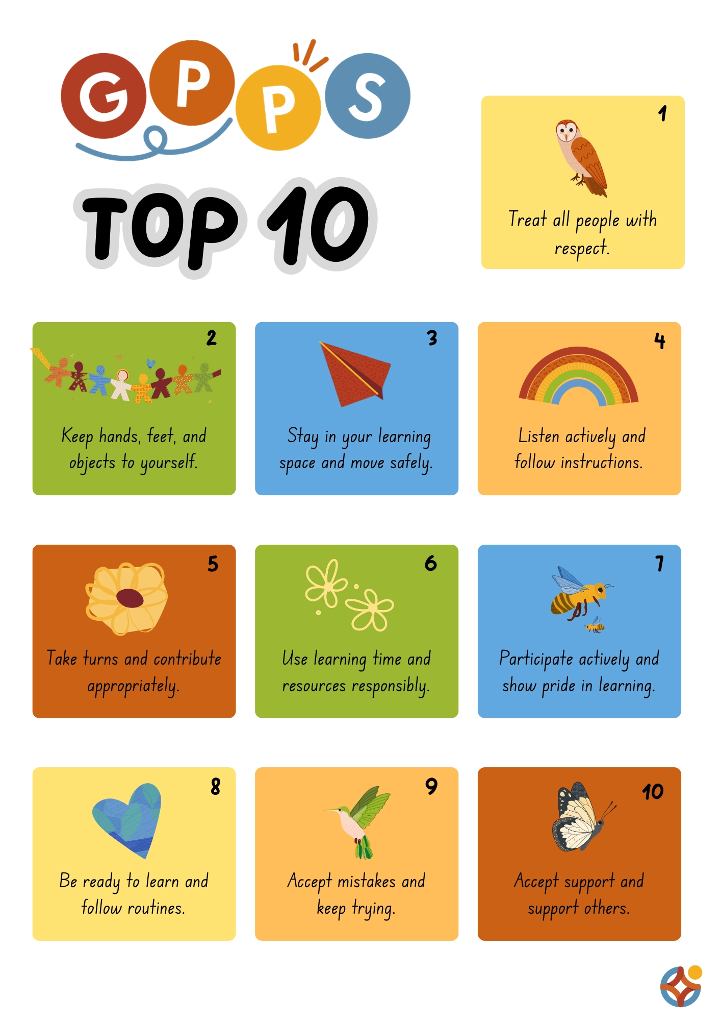Our Gilgai Top 10 connect to our School Wide Positive Behaviour Support (SWPBS) framework. These are 10 key behaviour expectations that reflect our school’s collective commitment to creating a safe, respectful and inclusive learning environment for all students.